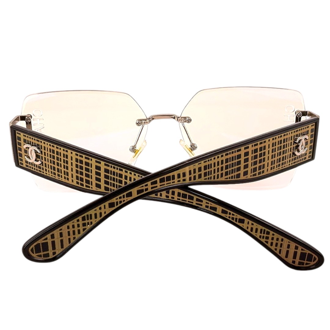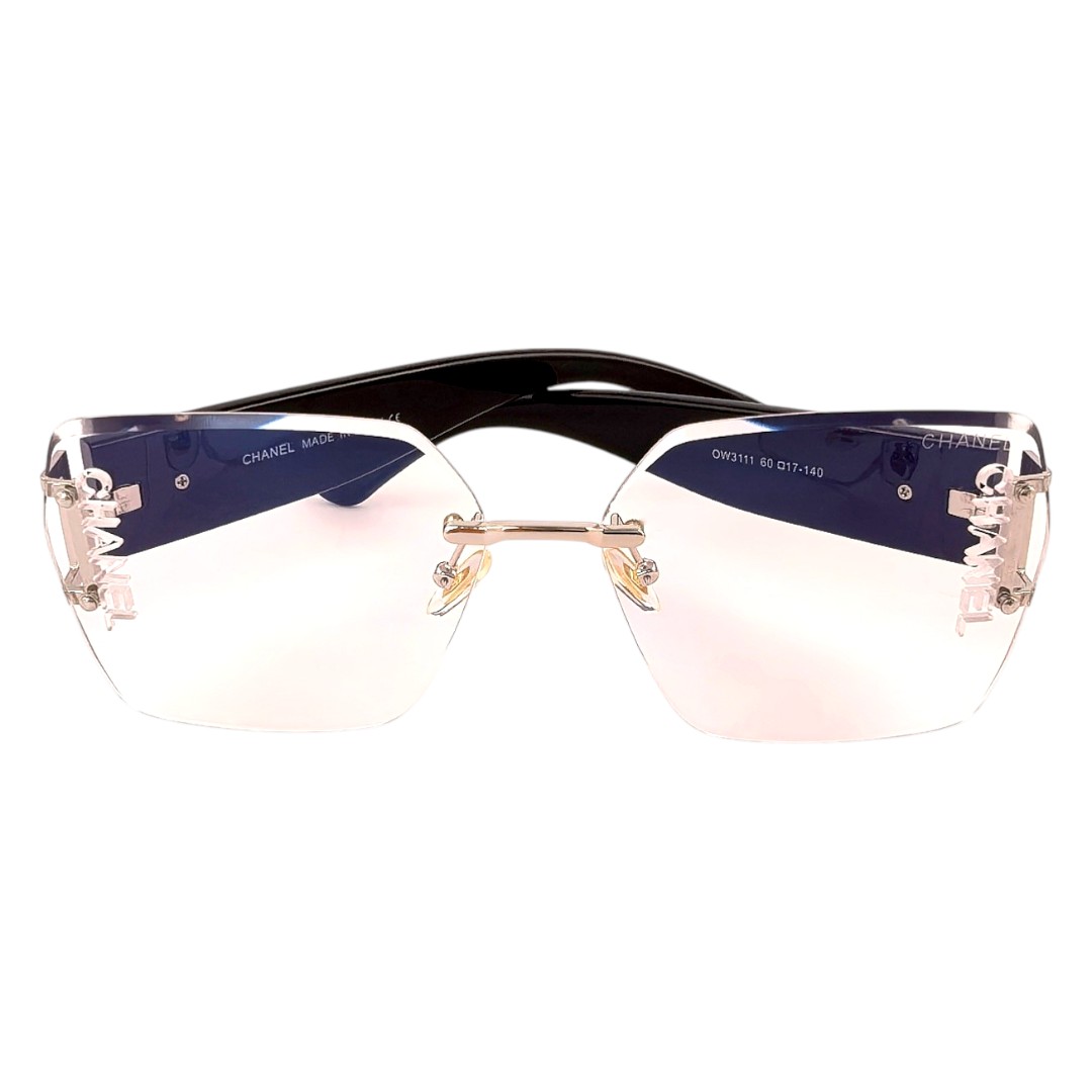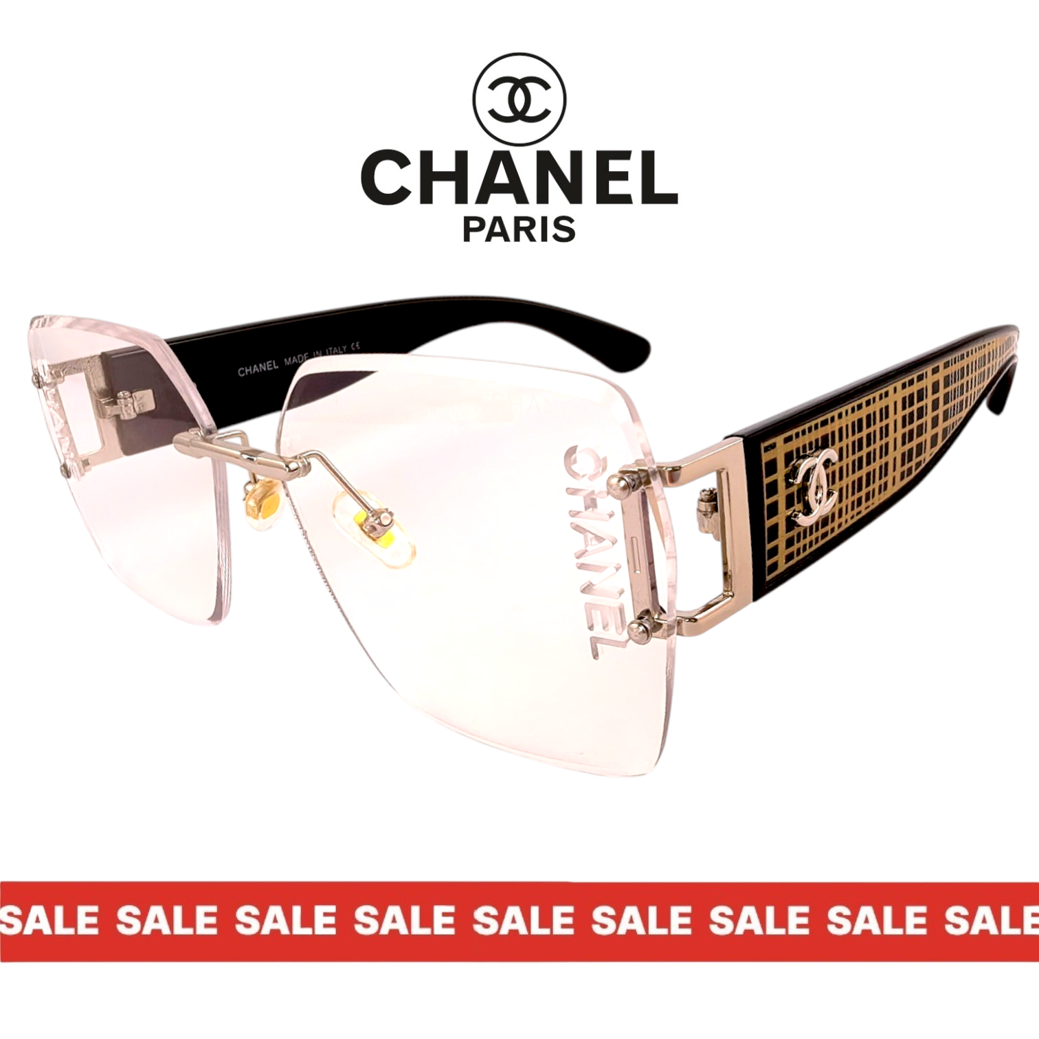 Характерен акцент при този модел е изрязаният надпис Chanel върху стъклото, който придава разпознаваем и оригинален дизайнерски детайл. Дръжките са със златна декоративна структура и характерното лого на Chanel, което подчертава луксозната визия на очилата.