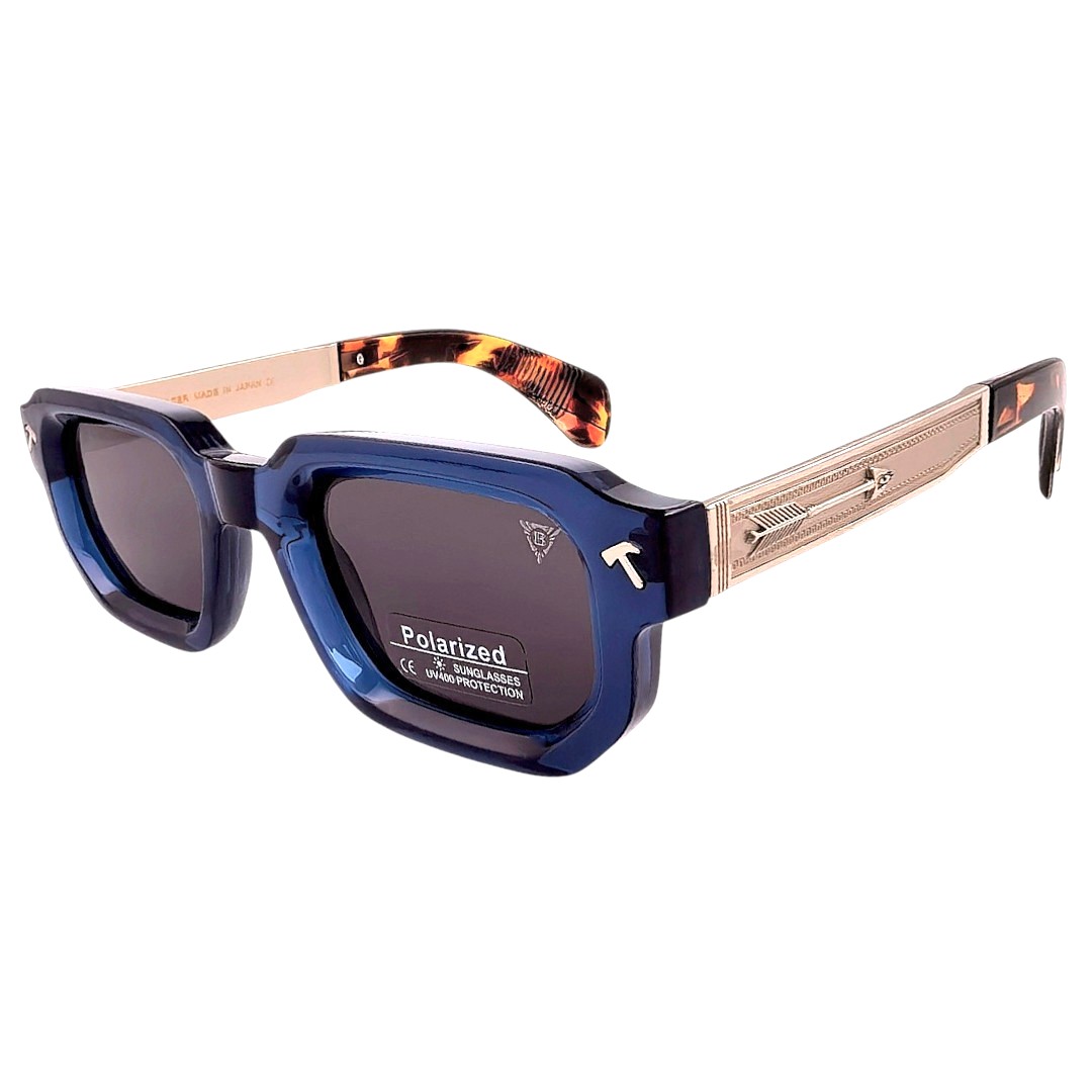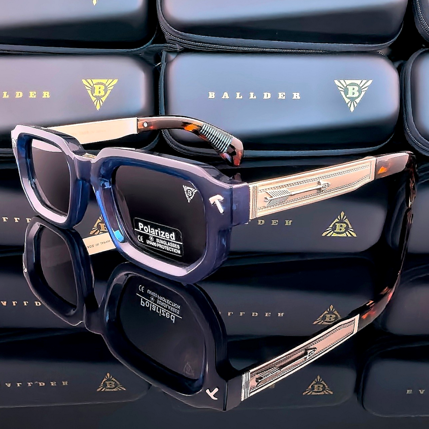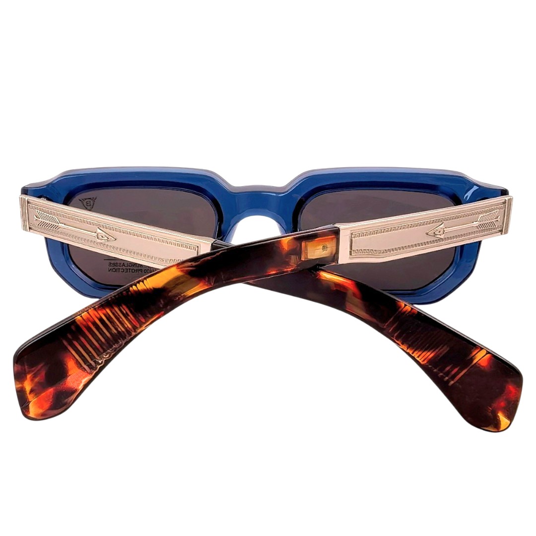 Рамката в синьо, сребристо и кафяво носи дълбочина, по-нестандартен акцент и силно запомнящо се излъчване, а богатите странични метални елементи подчертават премиум изработката и вниманието към детайла. Черните стъкла завършват модела с плътен и категоричен ефект, като придават още по-силен характер и балансирана завършеност. Този модел е сред малкото модели на Ballder, които освен UV400 защита предлагат и поляризация, което го прави още по-специален избор за хора, които търсят не само отличителна визия, но и по-високо ниво на комфорт при носене.