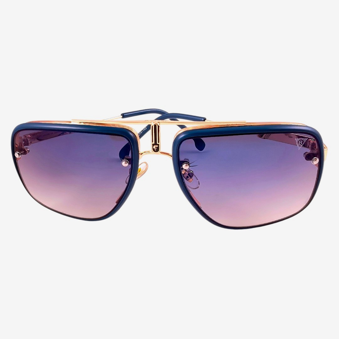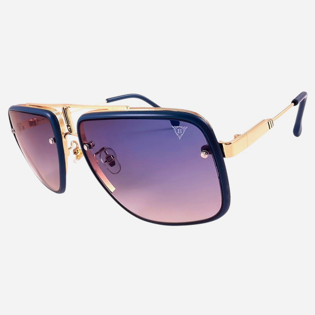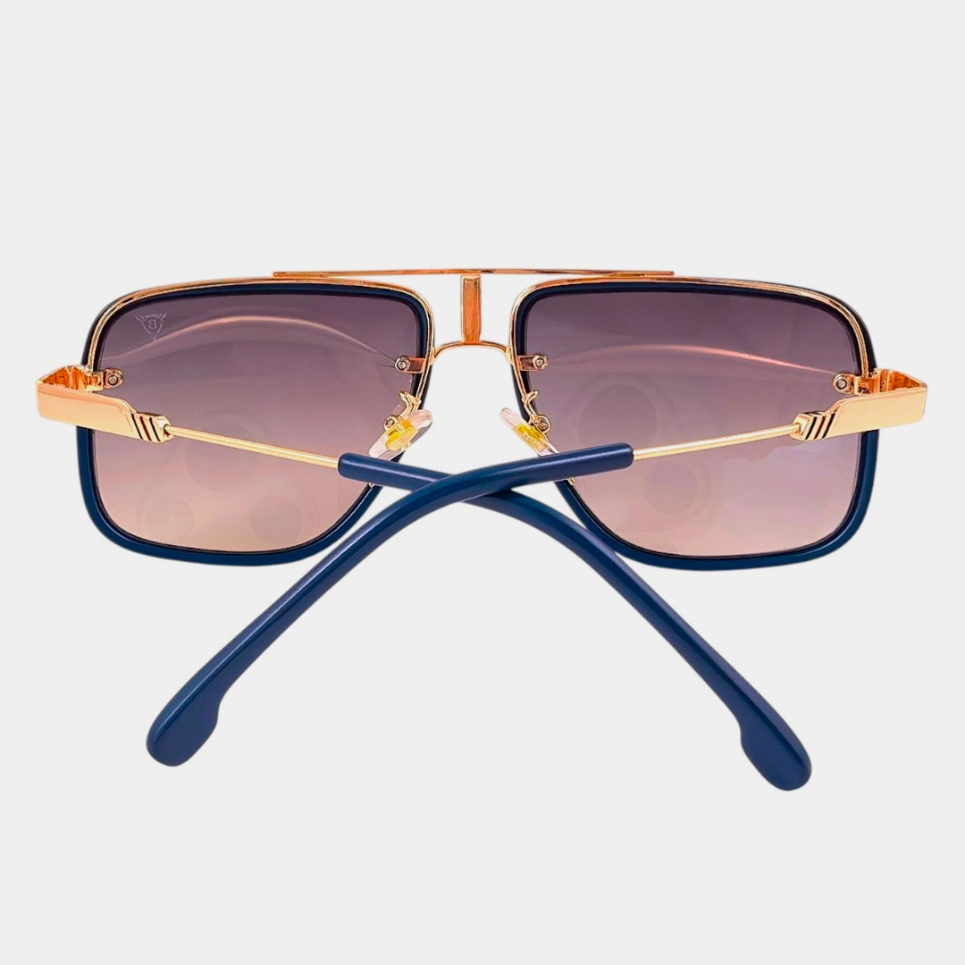 Златно синята рамка съчетава дълбочина, блясък и изразителен контраст, който прави модела много запомнящ се. Сините стъкла допълват цялостното излъчване със свеж и силно открояващ се акцент, като придават още по-завършена и модерна визия. Фината метална конструкция и изчистените странични елементи подчертават премиум усещането и вниманието към детайла. Това е модел за хора, които търсят по-специален аксесоар, отличителен силует и луксозен акцент с характер.