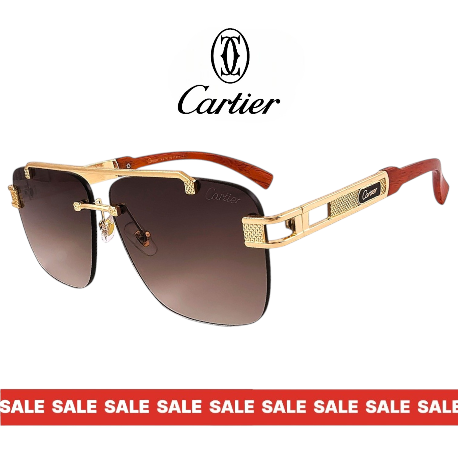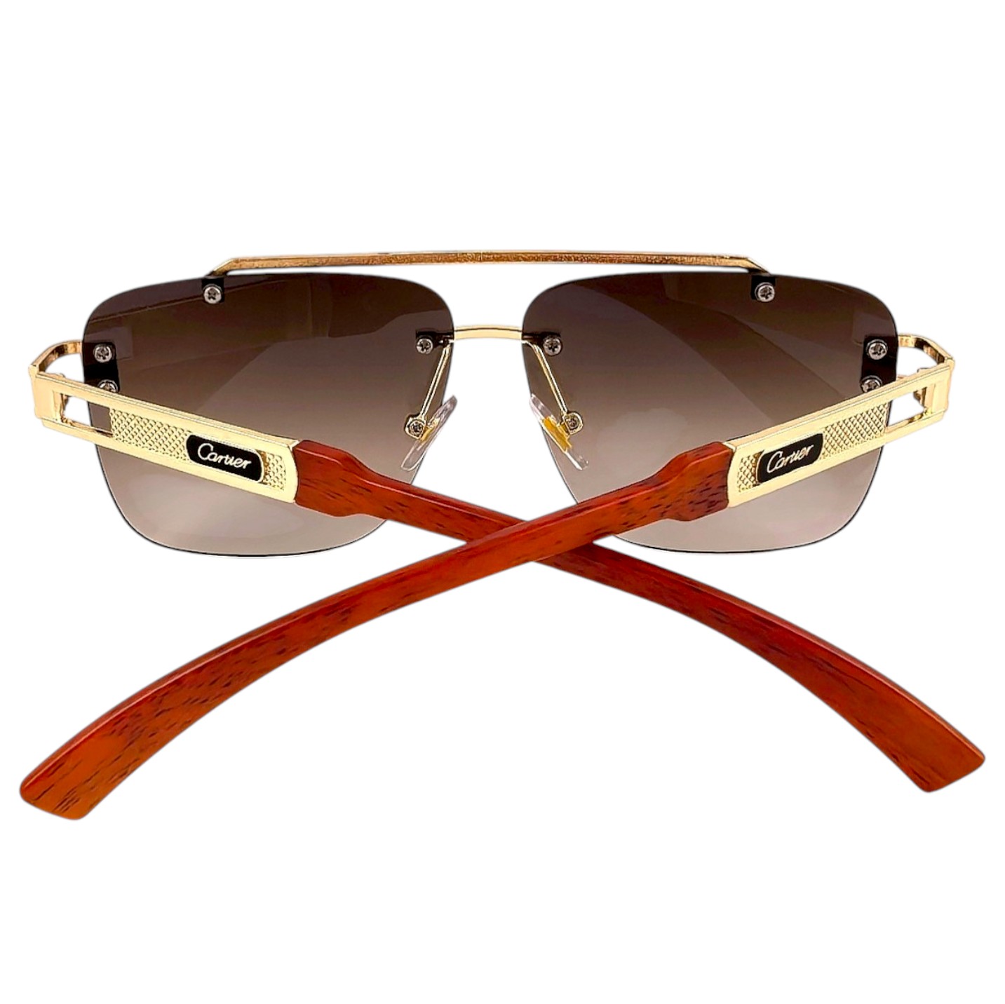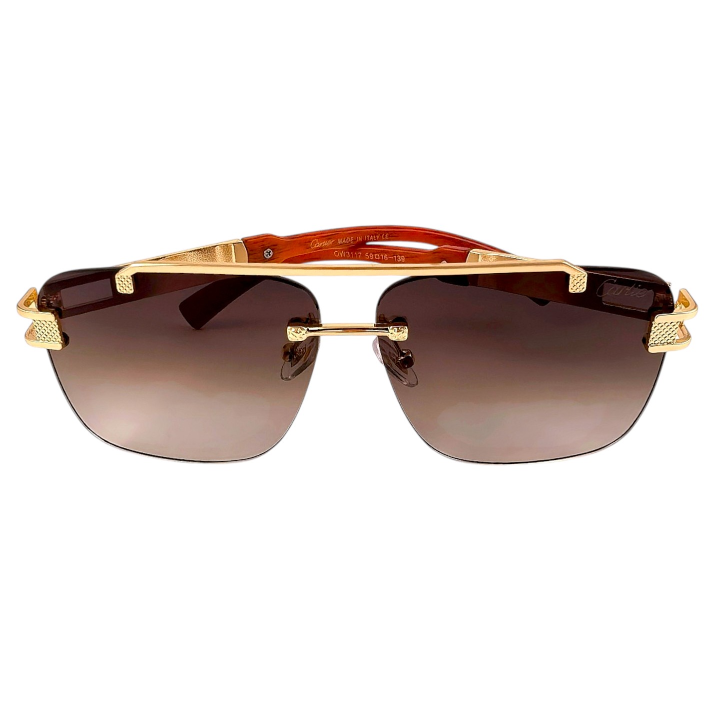 Кафявите стъкла създават мек контраст и естествена дълбочина на погледа. Този модел слънчеви очила комбинира премиум изработка с ясно разпознаваем брандиран елемент Cartier по дръжките, което придава завършен и категоричен вид.