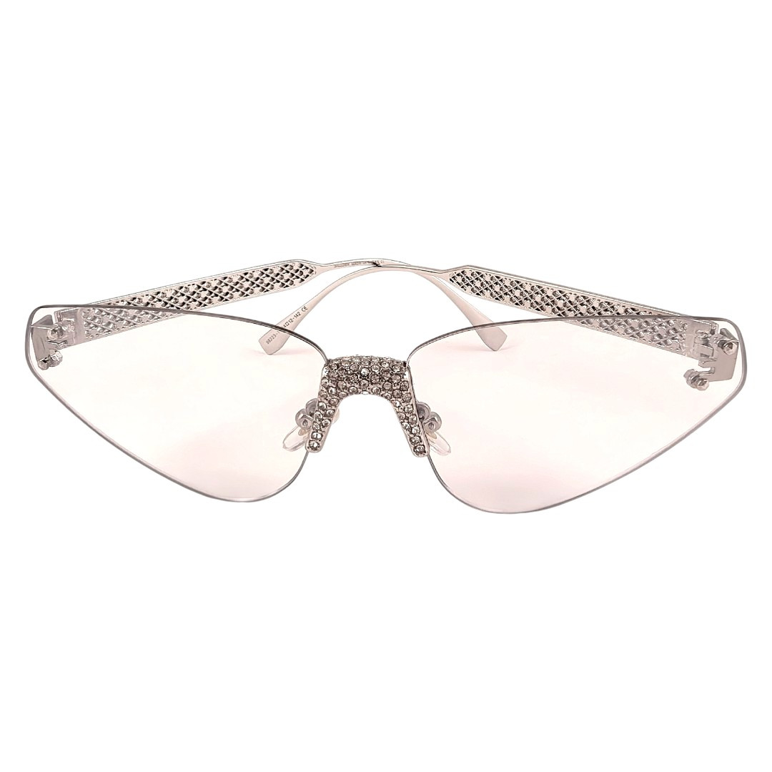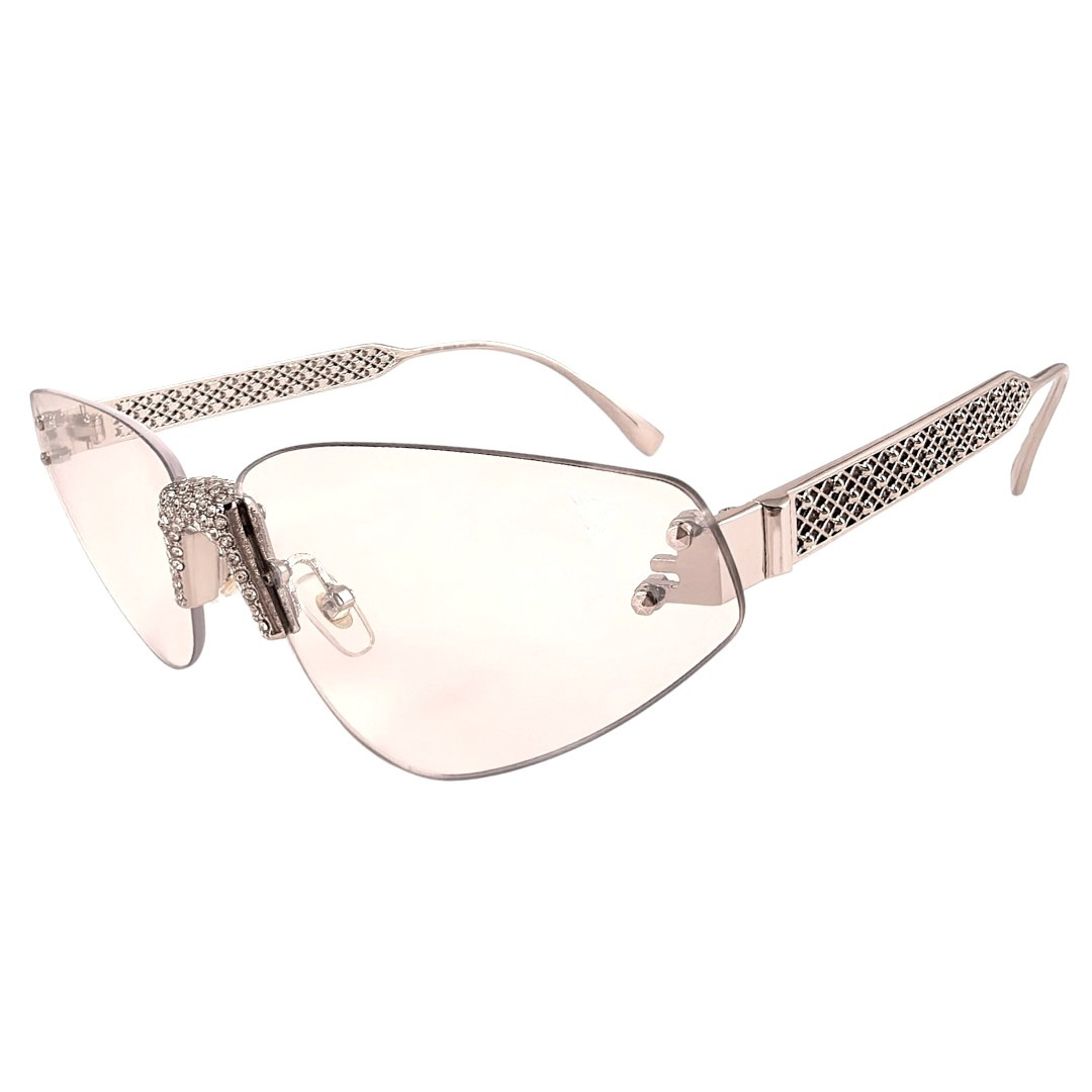 Сребристата рамка носи изчистен и луксозен акцент, а прозрачният ефект в конструкцията прави модела още по-интересен и визуално лек. В средната част се открояват циркониеви камъчета, които придават блясък и подчертават премиум изработката. Сребърните огледални стъкла добавят силен и модерен акцент, като завършват модела с по-отличително и запомнящо се излъчване. Това е модел за дами, които търсят по-специален аксесоар, луксозна визия и много силно присъствие.