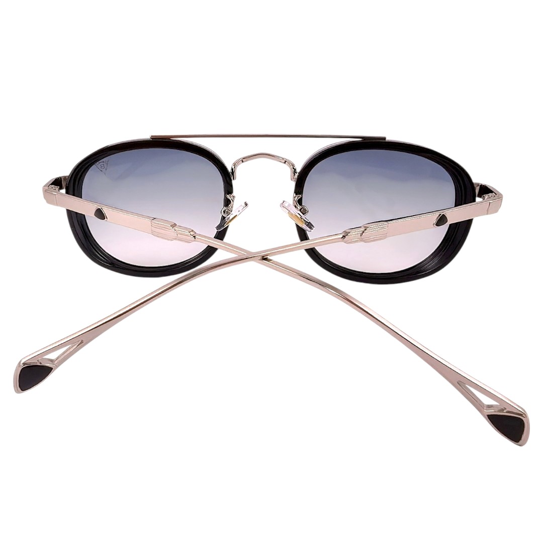 Сребристата рамка носи изчистен и премиум акцент, а фината конструкция подчертава вниманието към детайла и луксозното усещане на модела. Светло сините стъкла завършват визията с по-свеж и открояващ се ефект, като придават по-лека, модерна и запомняща се линия. Общото излъчване е балансирано, стилно и много подходящо за хора, които търсят по-специален аксесоар с ясно изразен характер и луксозен завършек.