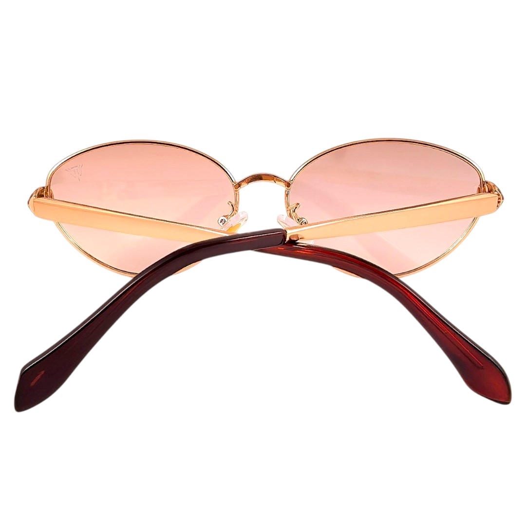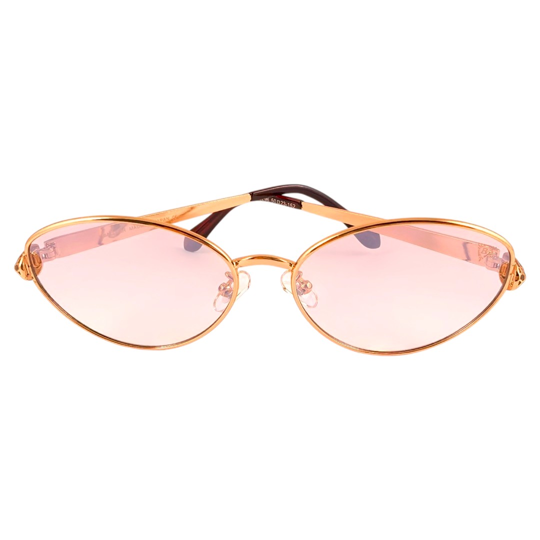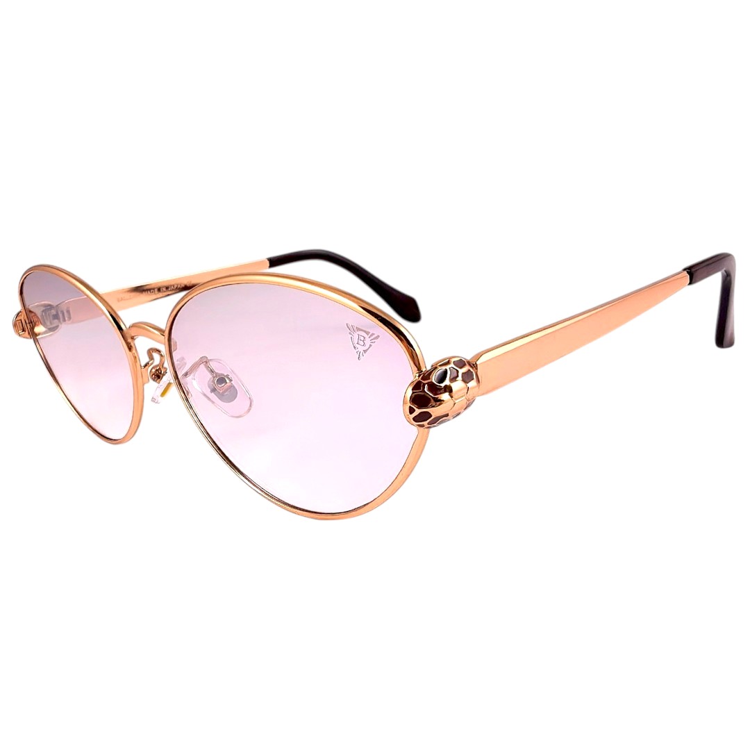 Златната рамка носи топъл, луксозен и открояващ се завършек, а огледалните стъкла добавят по-силен визуален ефект и по-отличително излъчване. В страничната част се откроява декоративен акцент с глава на змия, който прави модела по-интересен и подчертава вниманието към детайла. Това е дамски модел, подходящ за ежедневни визии, разходки, пътуване, градска среда и по-елегантно присъствие.