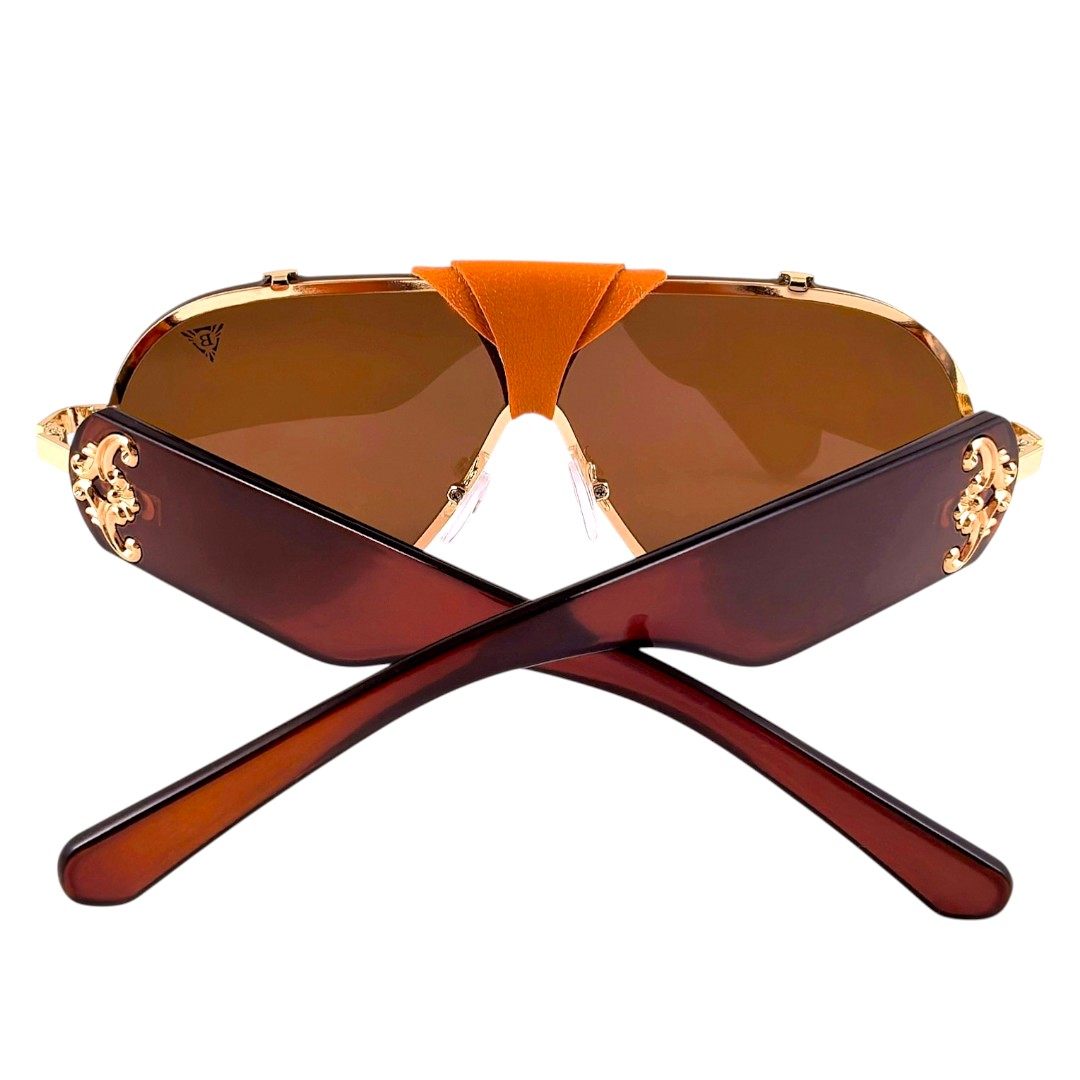 Комбинацията между златно и кафяво в рамката носи топло, луксозно и много отличително излъчване, а кафявата кожа в централната част подчертава характерната визия на модела. Кафявите стъкла завършват очилата с по-мек, балансиран и елегантен вид. В страничната част се открояват луксозни декоративни елементи в златист тон, които придават още по-богат вид и подчертават вниманието към детайла. Моделът е подходящ както за по-смели ежедневни визии, така и за почивка, разходки, пътуване и по-силно присъствие в градска среда.