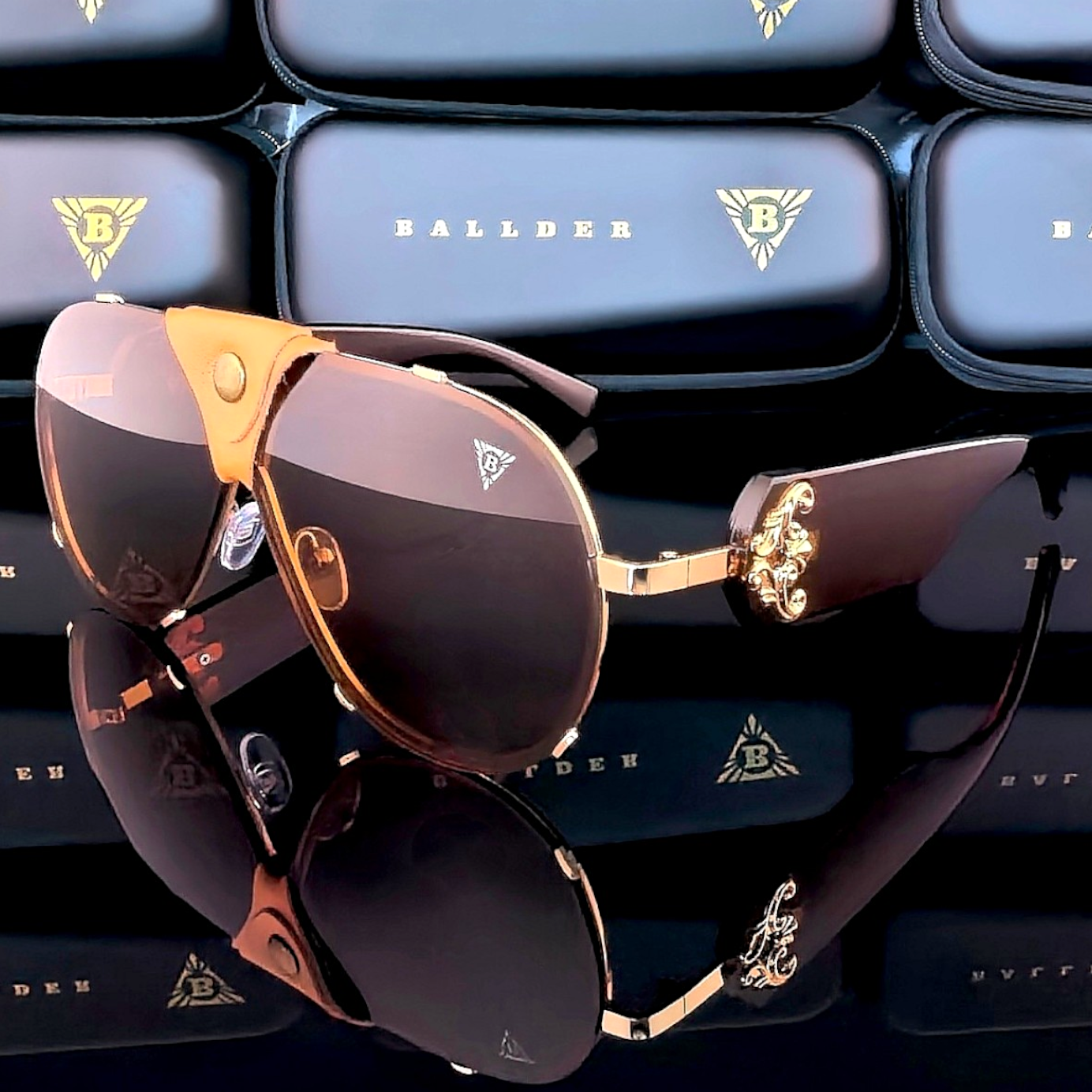 Слънчеви очила Ballder унисекс модел тип маска с отличителен луксозен дизайн, рамка в златно и кафяво и кафяв кожен елемент по средната горна част. Това е модел с много силно присъствие, създаден за хора, които търсят по-нестандартна визия, изчистена линия и запомнящ се акцент. Формата тип маска стои плътно, модерно и придава уверен характер на цялостното излъчване.