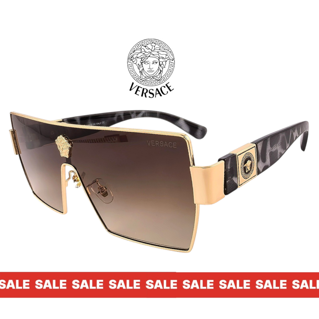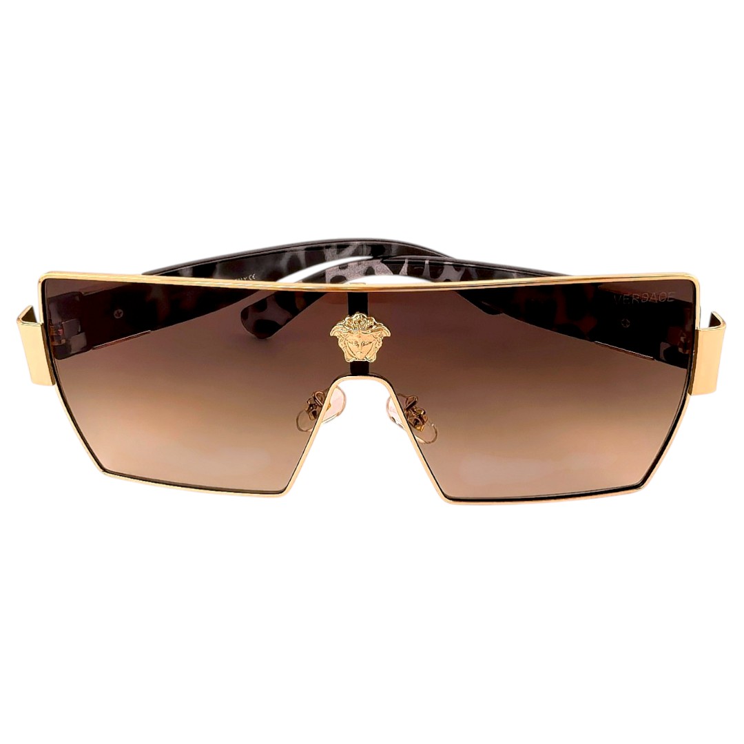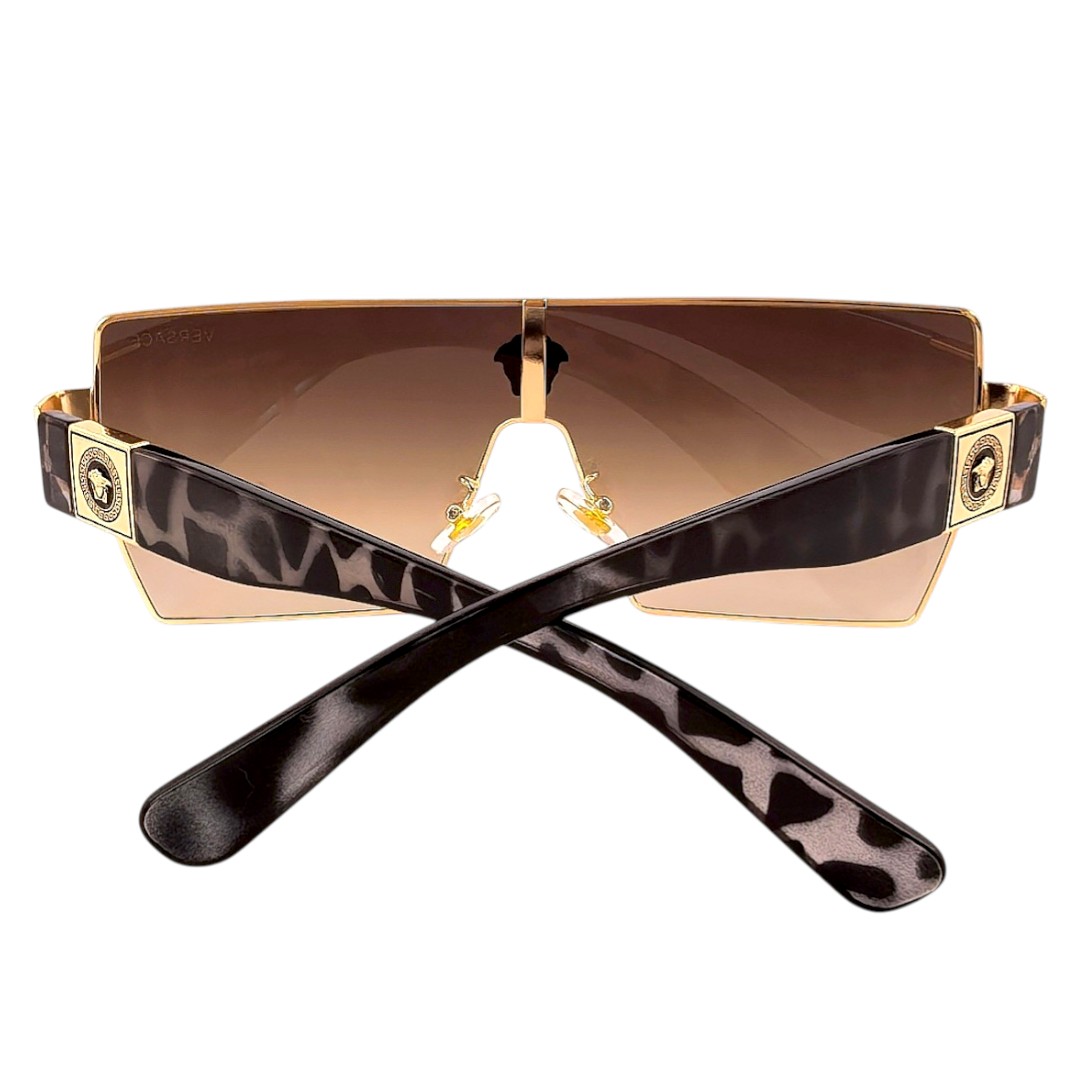 Широката форма тип маска осигурява плътно покритие и подчертава лицето с модерна, дръзка визия. Леопардовият десен придава индивидуалност и отличим почерк, а златистите детайли и емблематичните елементи на бранда завършват дизайна с луксозен акцент.
