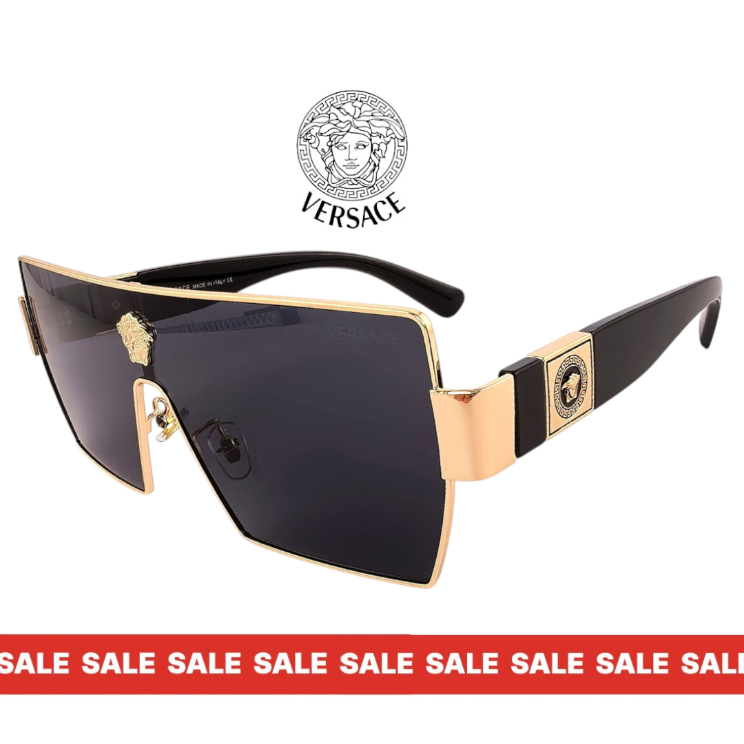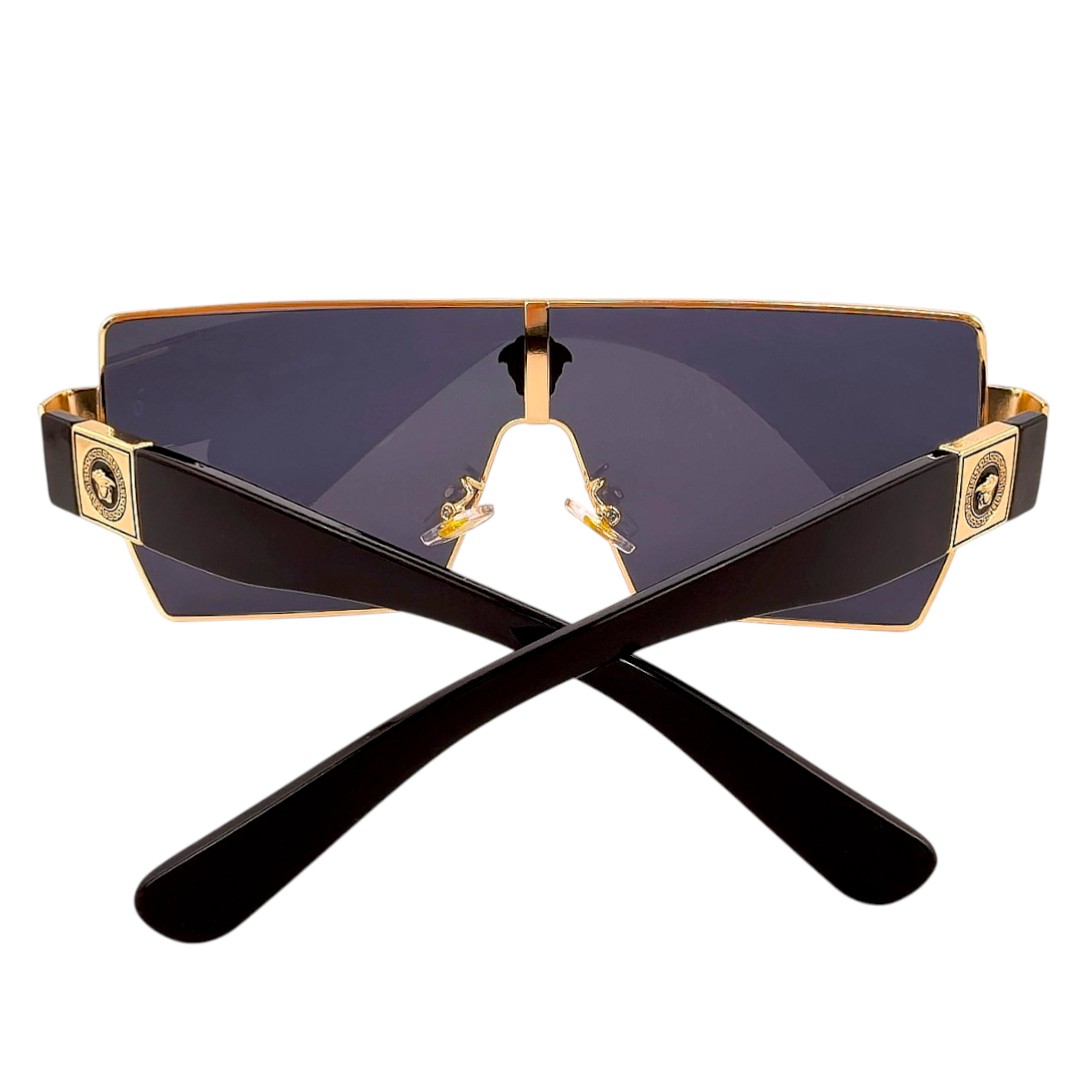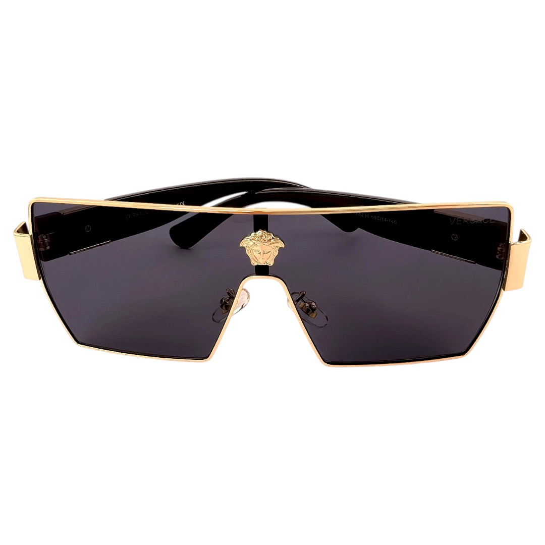 Слънчеви очила Versace колекция 2026 във впечатляваща черно-златна комбинация. Унисекс модел с масивна форма тип маска и силно изразено присъствие.