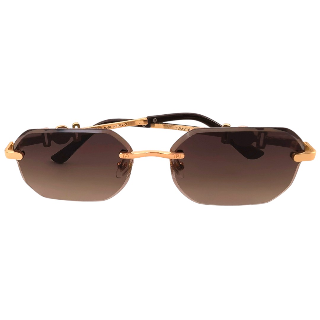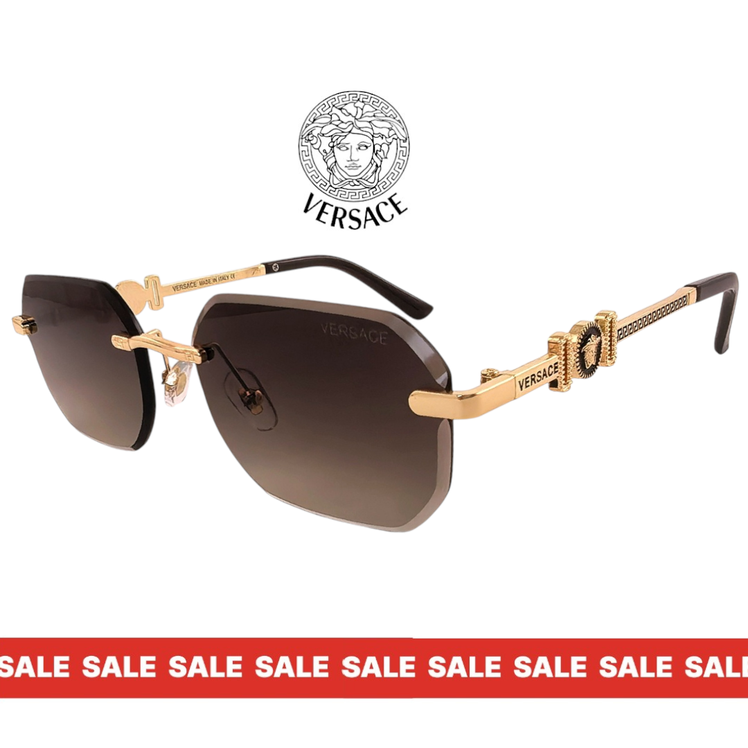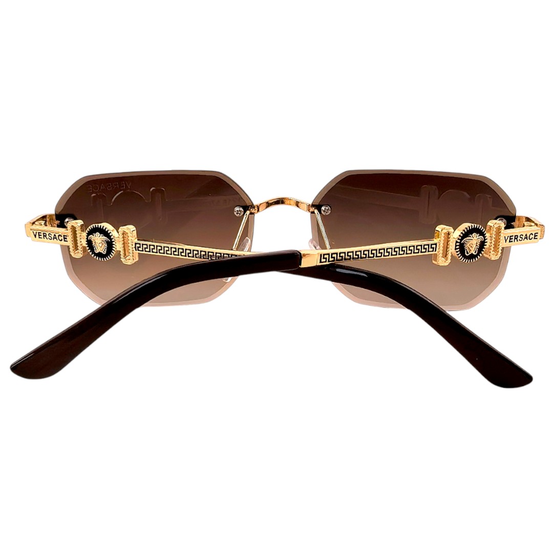 Моделът е със златна метална конструкция и кафяви лещи, които създават топъл визуален тон и балансиран контраст. Декоративните брандирани елементи по дръжките и характерният Medusa акцент подчертават разпознаваемия почерк на Versace.