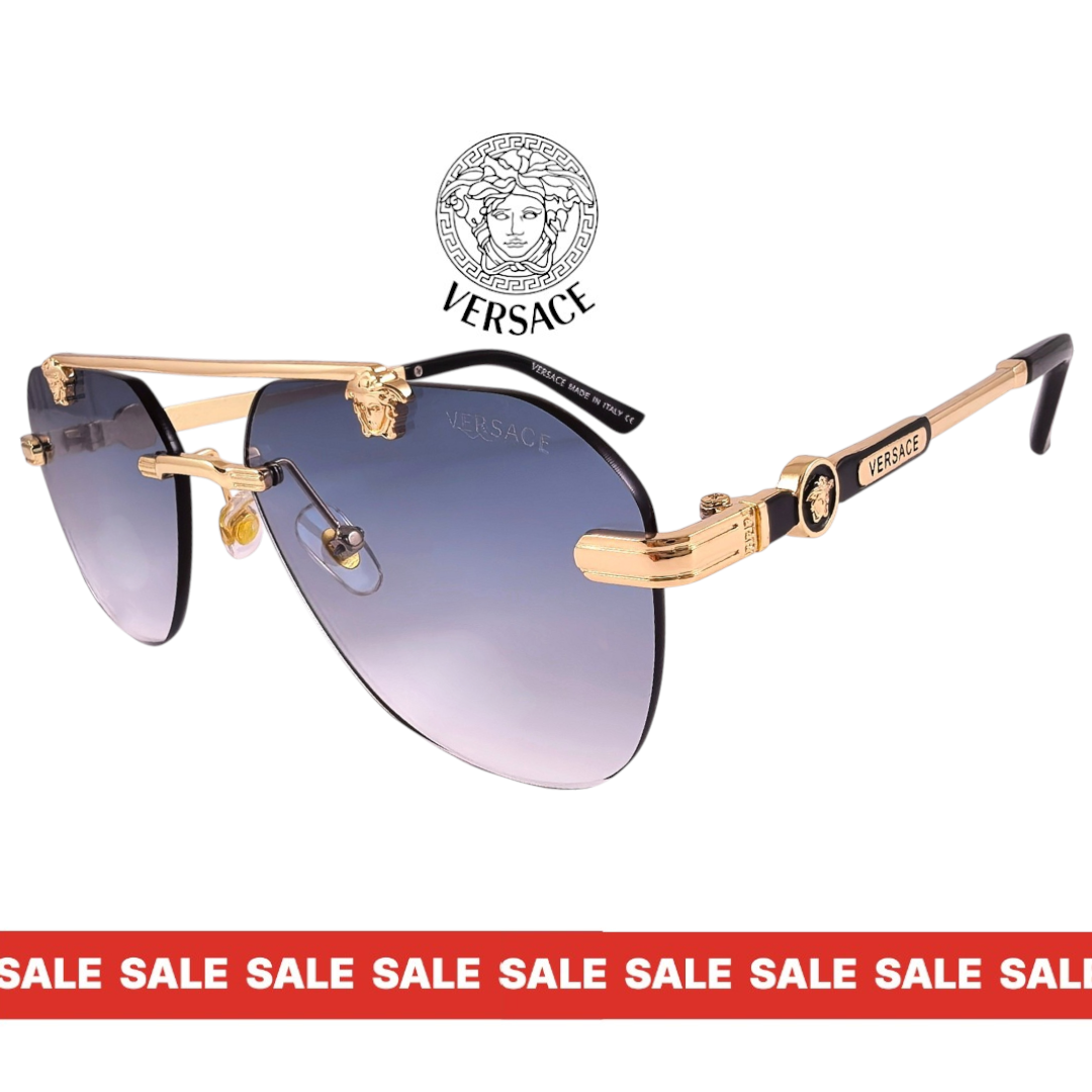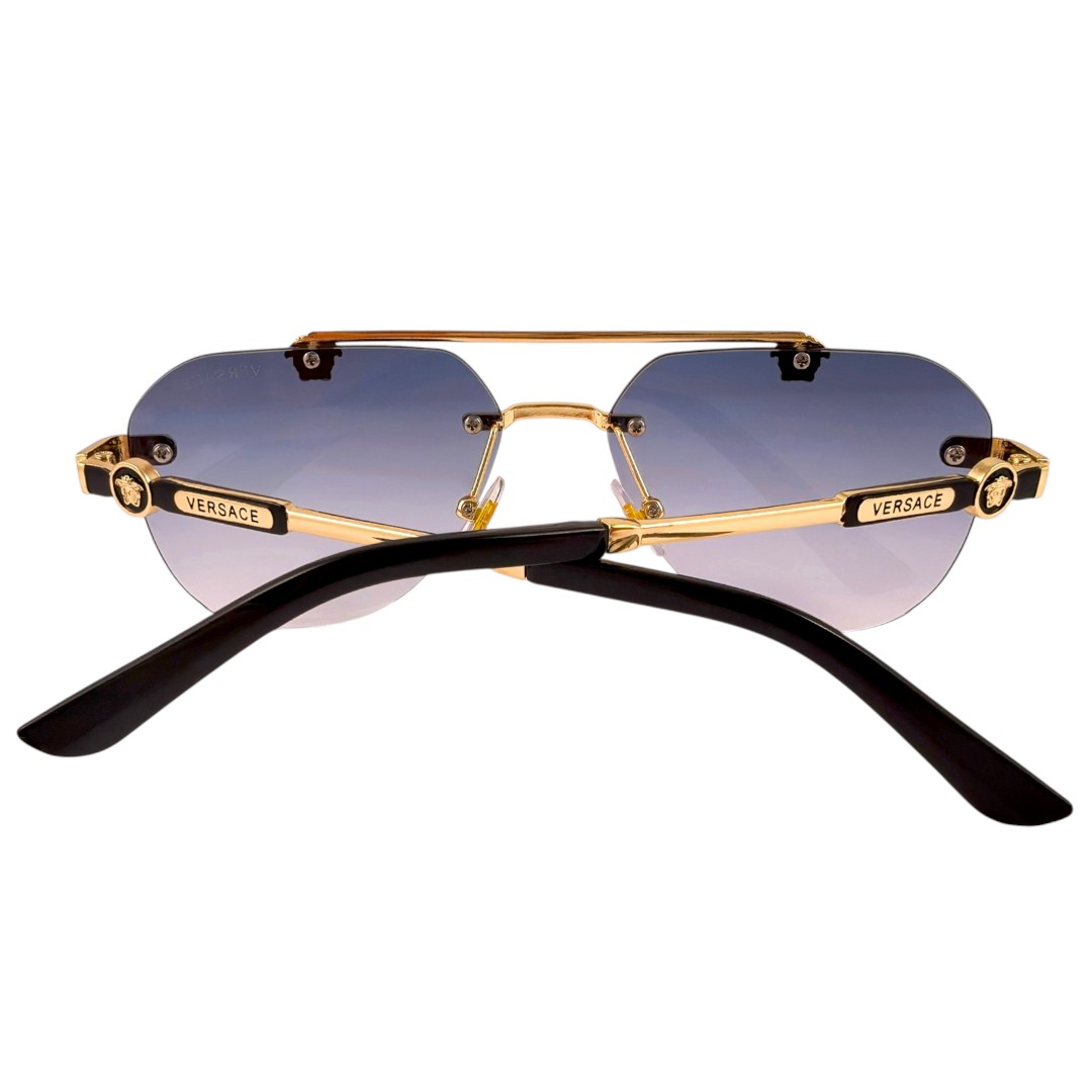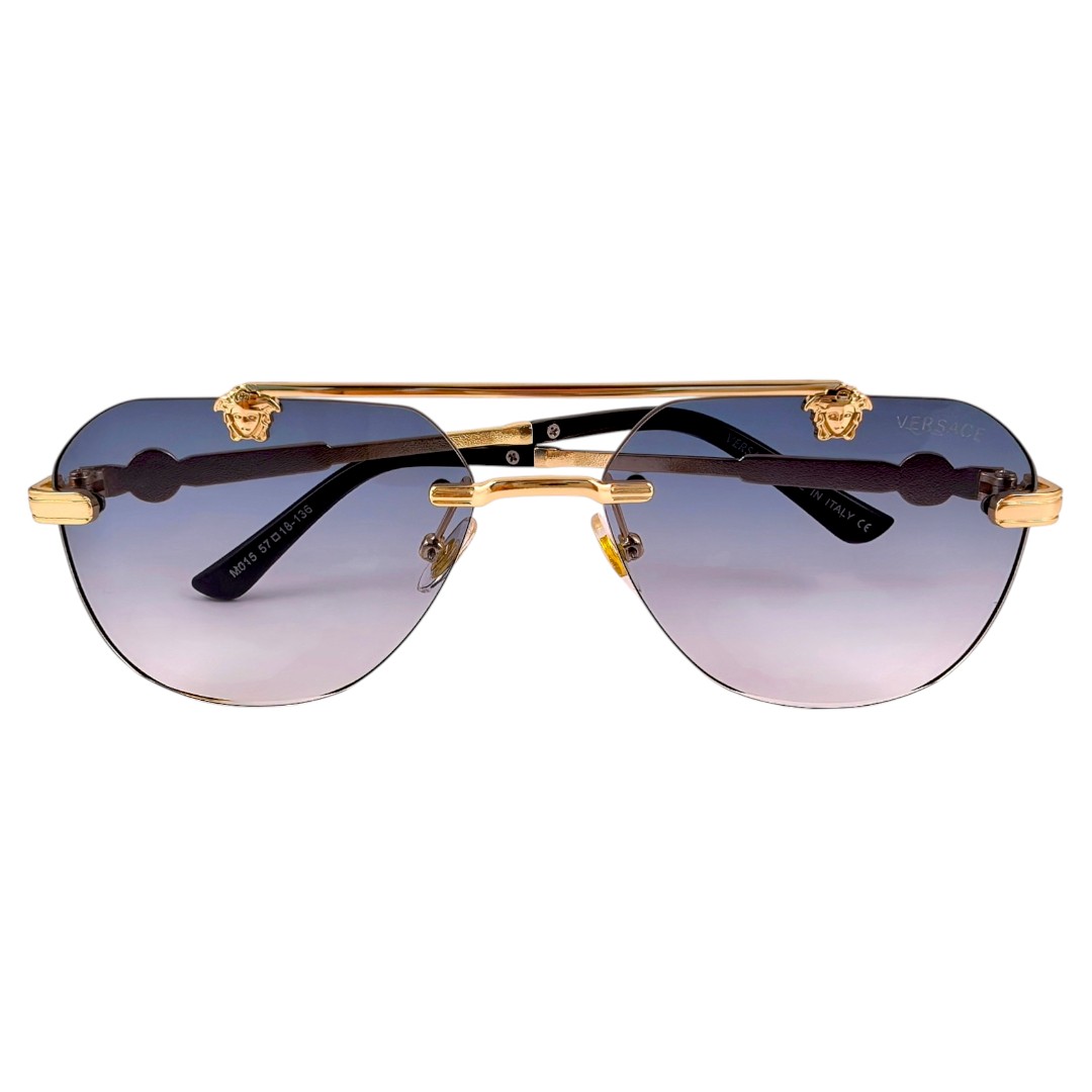 Мъжките слънчеви очила Versace колекция 2026 във форма авиатор със златна рамка и сини преливащи стъкла съчетават класическа линия с модерно излъчване. Формата авиатор придава балансирана и уверена визия, а златната метална конструкция подчертава луксозния характер на модела.
